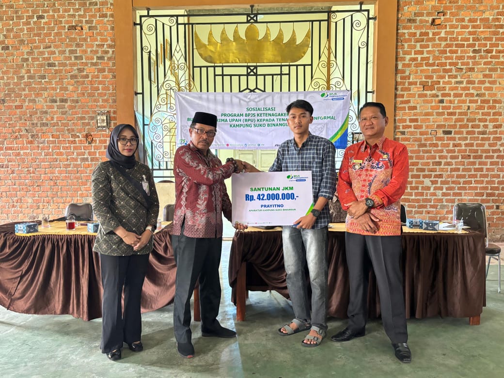 Penyerahan santunan BPJS Ketenagakerjaan dilakukan pada saat kegiatan sosialisasi program yang diselenggarakan oleh BPJS Ketenagakerjaan Cabang Lampung Tengah di Balai Kampung Suko Binangun, Kecamatan Way Seputih, 6 November 2025.