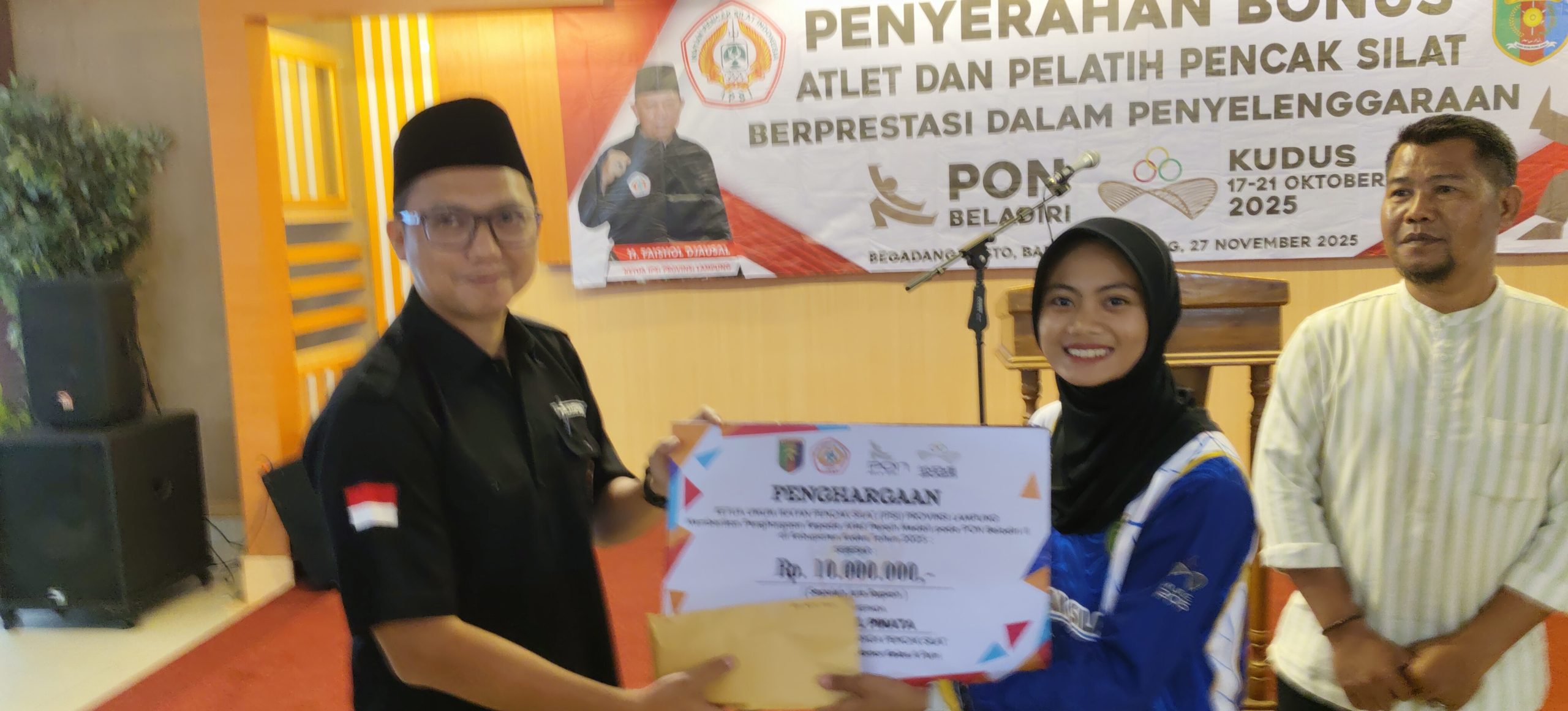 Bonus tersebut, diberikan kepada lima atlet silat Lampung dengan rincian dua atlet meraih medali emas, dua atlet meraih medali perak, dan satu atlet meraih medali perunggu.