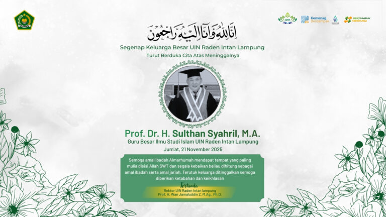Bandar Lampung, Metropolis – Keluarga Besar Universitas Islam Negeri (UIN) Raden Intan Lampung (RIL) menyampaikan duka cita mendalam atas wafatnya Prof. Dr. H. Sulthan Syahril, MA, Guru Besar Bidang Ilmu Studi Islam. Almarhum menghembuskan napas terakhir pada Jumat, 21 November 2025, pukul 10.27 WIB di RS Advent Bandar Lampung. Kabar duka ini meninggalkan kesedihan mendalam bagi keluarga, kerabat, dan sivitas akademika.