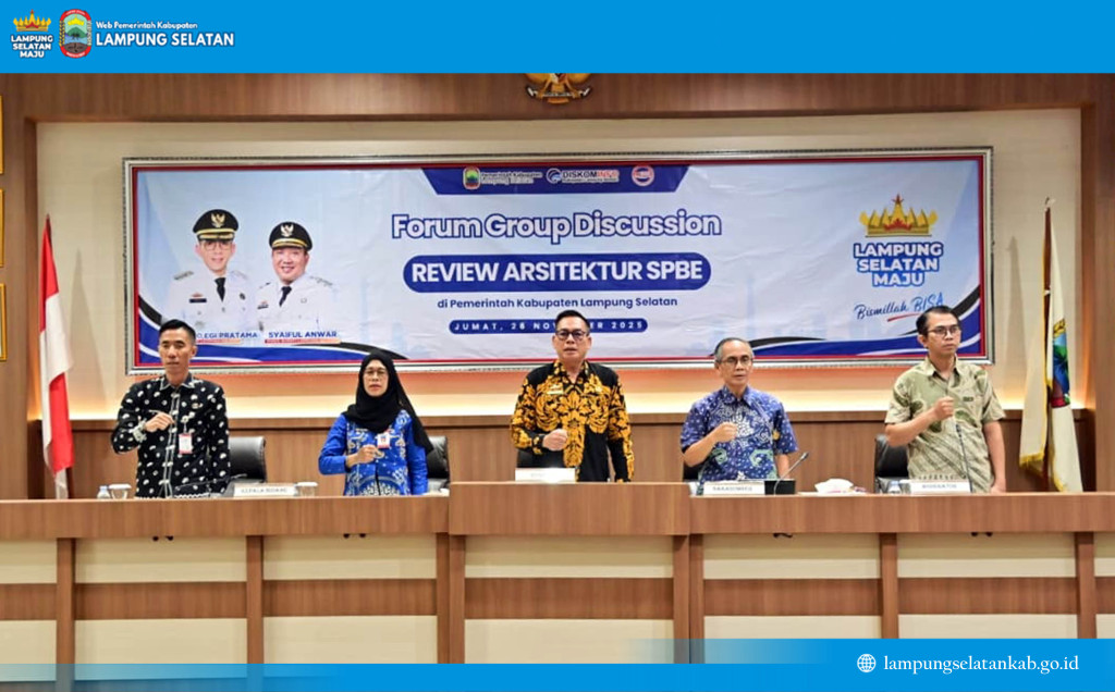 Kalianda – Pemerintah Kabupaten (Pemkab) Lampung Selatan melalui Dinas Komunikasi dan Informatika (Kominfo) menggelar Forum Group Discussion (FGD) Review Arsitektur Sistem Pemerintahan Berbasis Elektronik (SPBE) dan Penyusunan Arsitektur Data di Aula Rajabasa, Kantor Bupati Lampung Selatan, Jumat (28/11/2025).