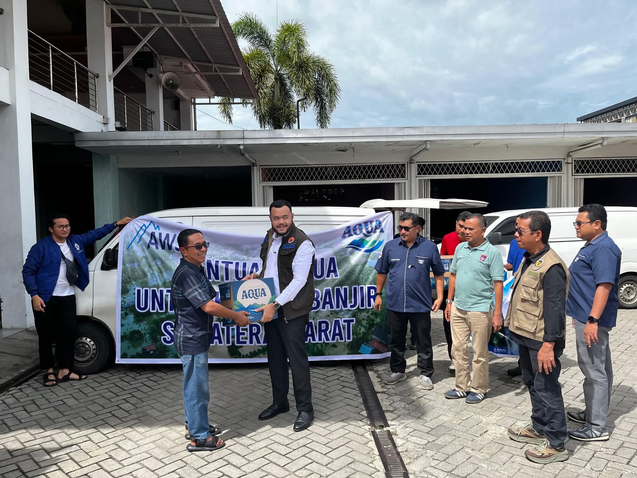 PT. Tirta Investama Pabrik Solok memberikan donasi berupa air mineral Aqua sebanyak 280 dus. Walaupun jalan dari Solok-Padang macet, tidak menyurutkan semangat Azra’i bersama rekan untuk mengantarkan bantuan kemanusiaan ini.