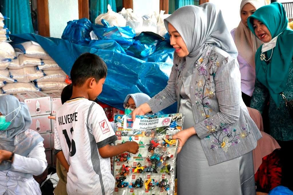 Padang – Posko Bencana di Guo, Kecamatan Kuranji, Kota Padang nampak berbeda dari biasa pada Rabu siang (3/12/2025). Anak-anak riuh bergembira. Pasalnya, Ketua Dekranasda Kota Padang, Ny Dian Puspita Fadly Amran datang membawa mainan.
