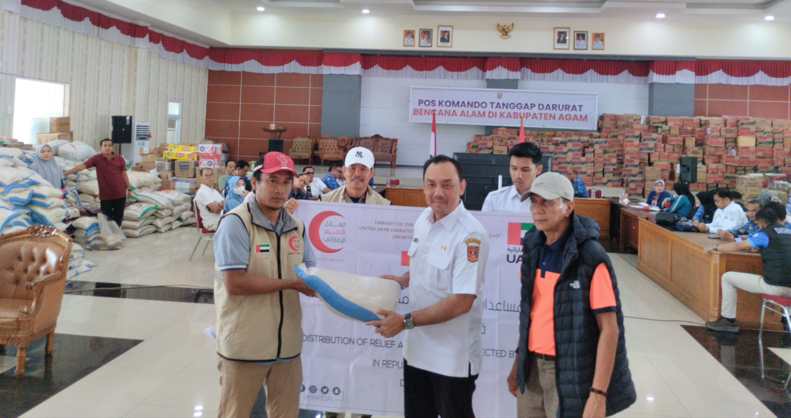 Penyerahan bantuan dilakukan oleh perwakilan Emirates Red Crescent, Hari, dan diterima langsung oleh Wakil Bupati Agam, Muhammad Iqbal, SE, M.Com, yang didampingi Asisten I Setda Agam, Yunelson, S.Sos, M.M. Kegiatan tersebut berlangsung sebagai bentuk kepedulian internasional terhadap korban bencana hidrometeorologi yang melanda wilayah Kabupaten Agam.