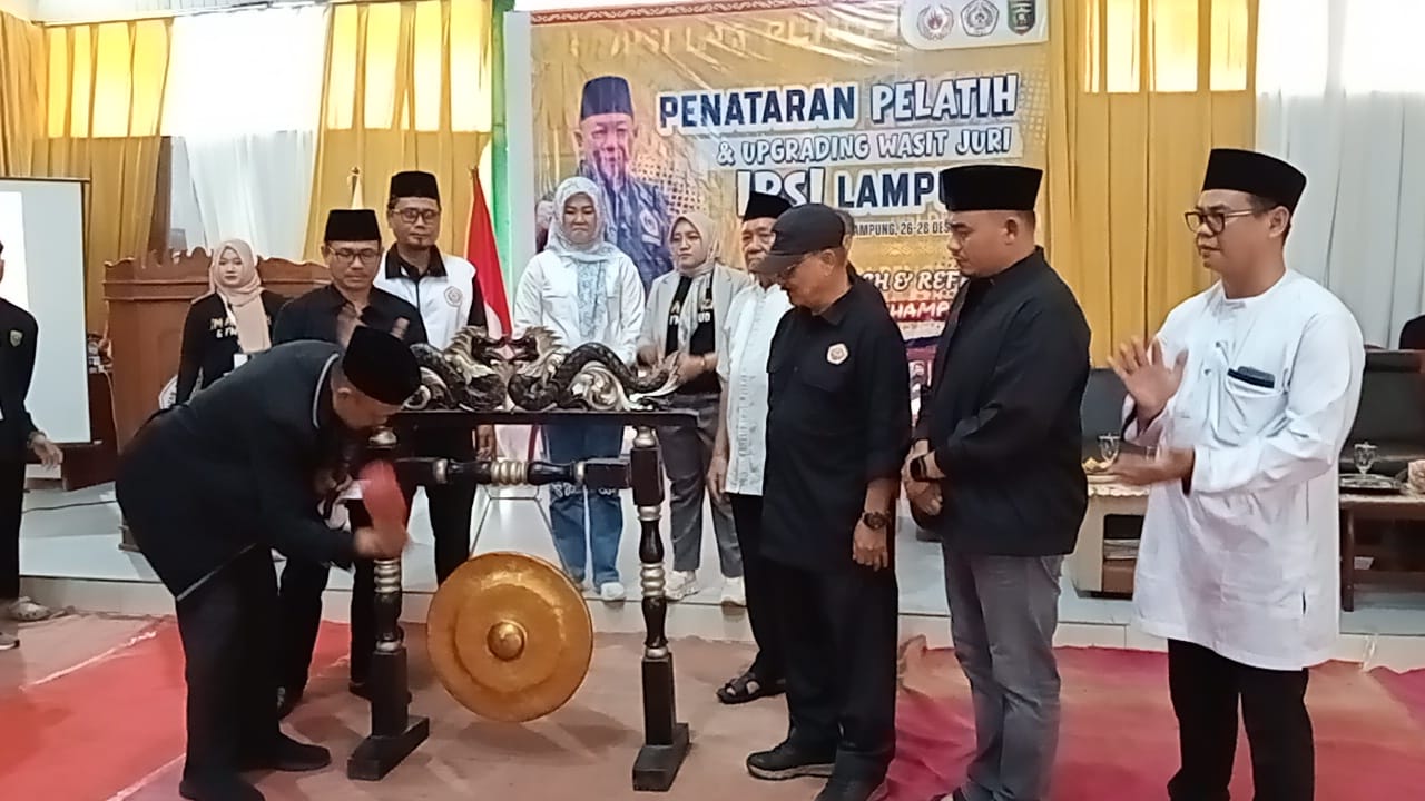Selanjutnya Ketum KONI tersebut membuka pelatihan, dengan memukul gong didampingi Waka I dan Sekretais Umum IPSI Lampung Riagus Ria.