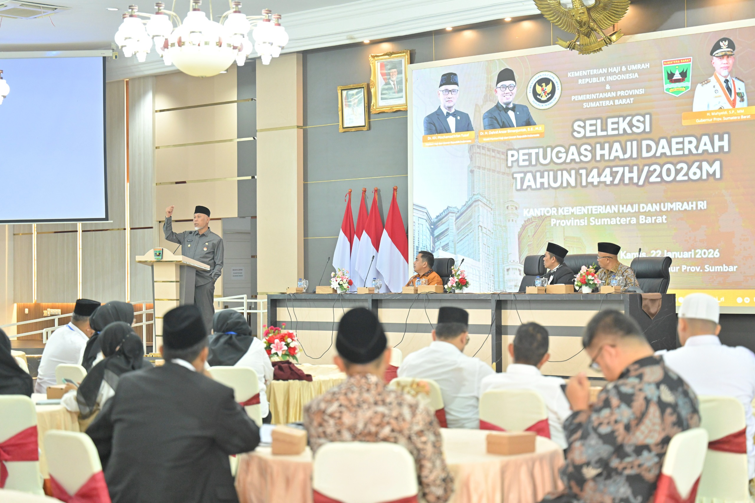 PADANG — Gubernur Sumatera Barat (Sumbar), Mahyeldi Ansharullah membuka secara resmi kegiatan seleksi Petugas Haji Daerah (PHD) Tahun 2026 yang diselenggarakan oleh Kementerian Haji dan Umrah Republik Indonesia di Auditorium Gubernuran, Kamis (22/1/2026).