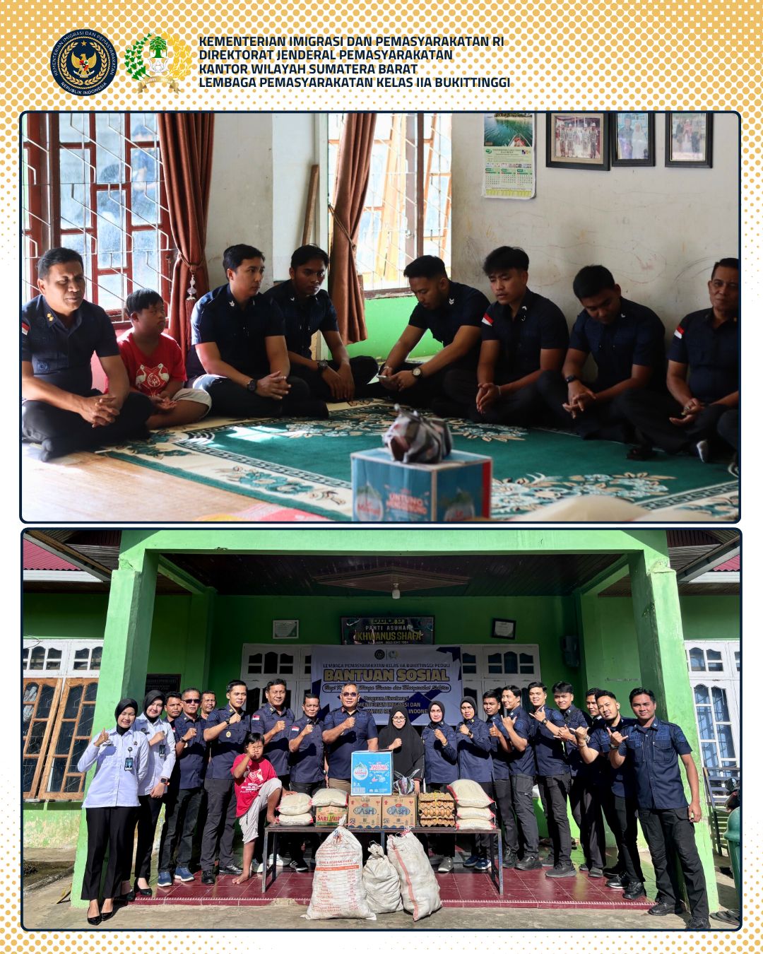 Penyerahan bantuan dipimpin langsung oleh Kepala Lapas Kelas IIA Bukittinggi, Nanang Rukmana, didampingi jajaran pejabat struktural dan staf. Bantuan yang diberikan berupa sembako dan perlengkapan kebutuhan pokok sehari-hari yang diharapkan dapat membantu memenuhi kebutuhan anak-anak asuh serta para lanjut usia yang tinggal di Panti Asuhan Ukhwanus Shafa.