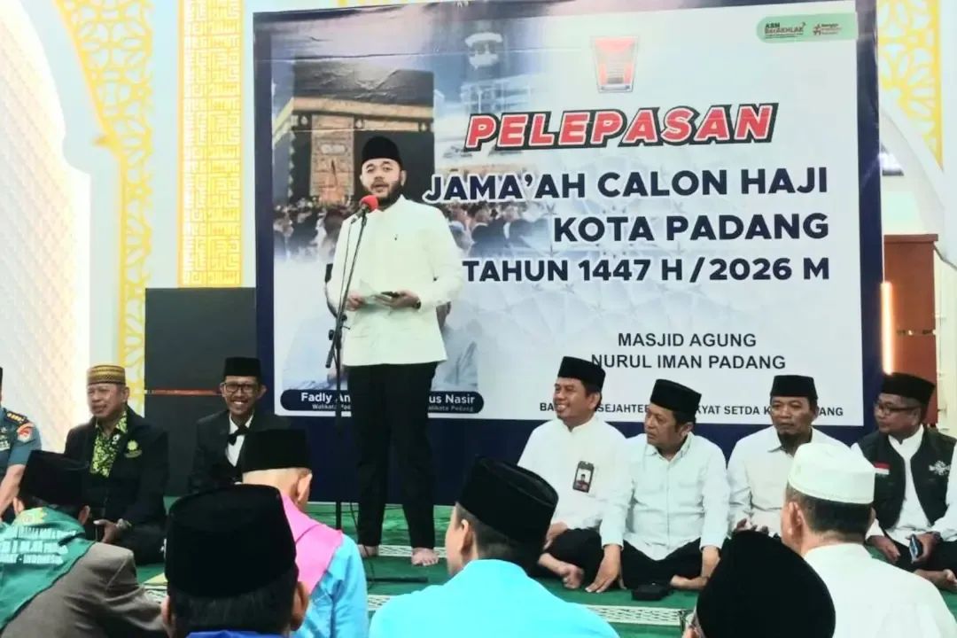 Padang – Wali Kota Padang Fadly Amran secara resmi melepas 386 Calon Jemaah Haji Kloter 1 Kota Padang di Masjid Agung Nurul Iman, Kamis (23/4/2026). Pelepasan berlangsung khidmat dan penuh haru, dihadiri keluarga jemaah serta sejumlah ASN di lingkungan Pemerintah Kota Padang.