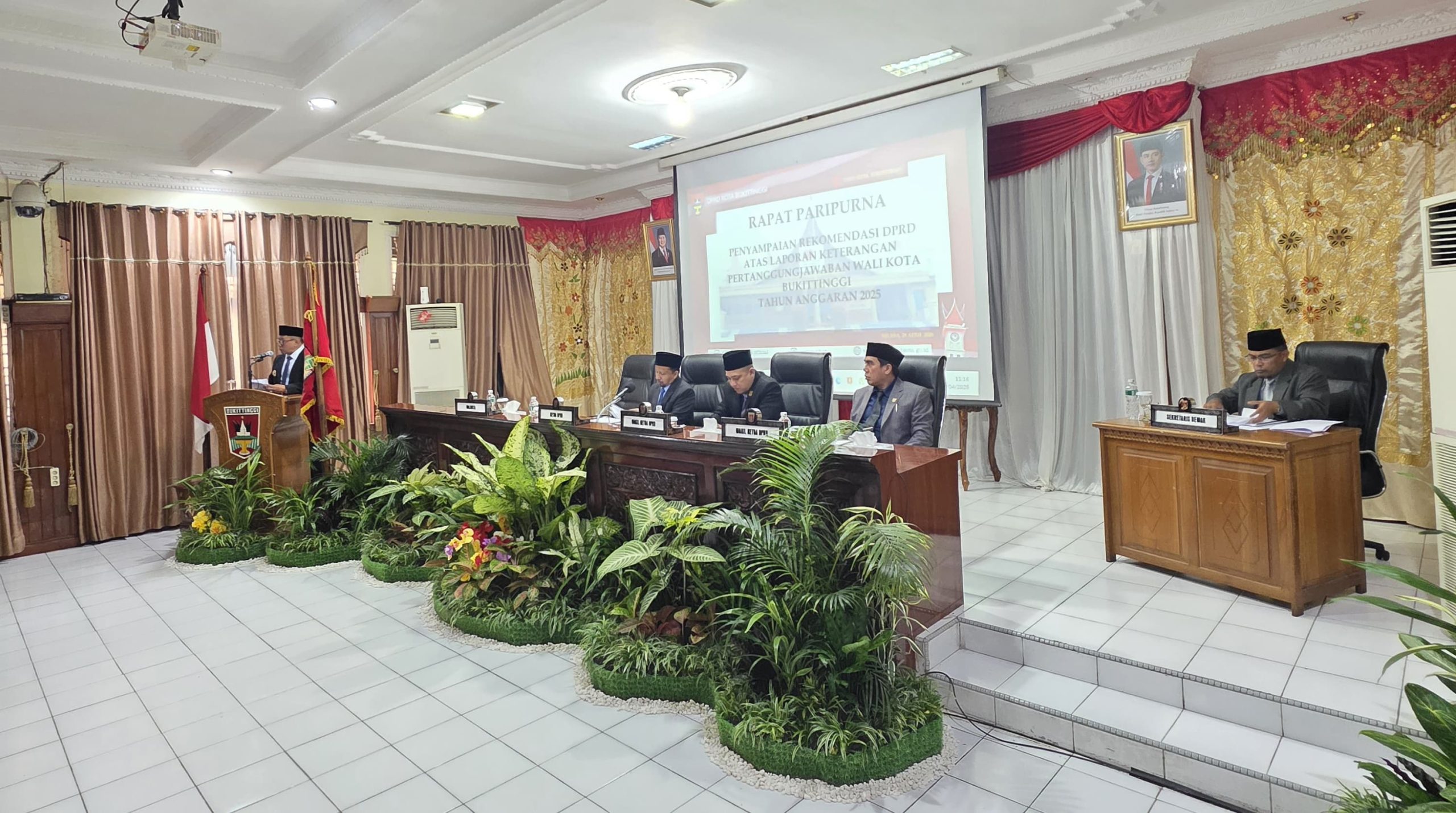 Bukittinggi,– Dewan Perwakilan Rakyat Daerah (DPRD) Kota Bukittinggi menyampaikan sejumlah rekomendasi hasil pembahasan terhadap Laporan Keterangan Pertanggungjawaban (LKPJ) Wali Kota Bukittinggi Tahun Anggaran 2025 dalam Rapat Paripurna yang berlangsung hari ini, Selasa (28/4/2026) di Aula Sidang Utama Gedung DPRD setempat. Kegiatan ini dihadiri oleh Wakil Wali Kota Bukittinggi yang mewakili Pemerintah Kota, pimpinan dan anggota DPRD, serta perwakilan perangkat daerah terkait.